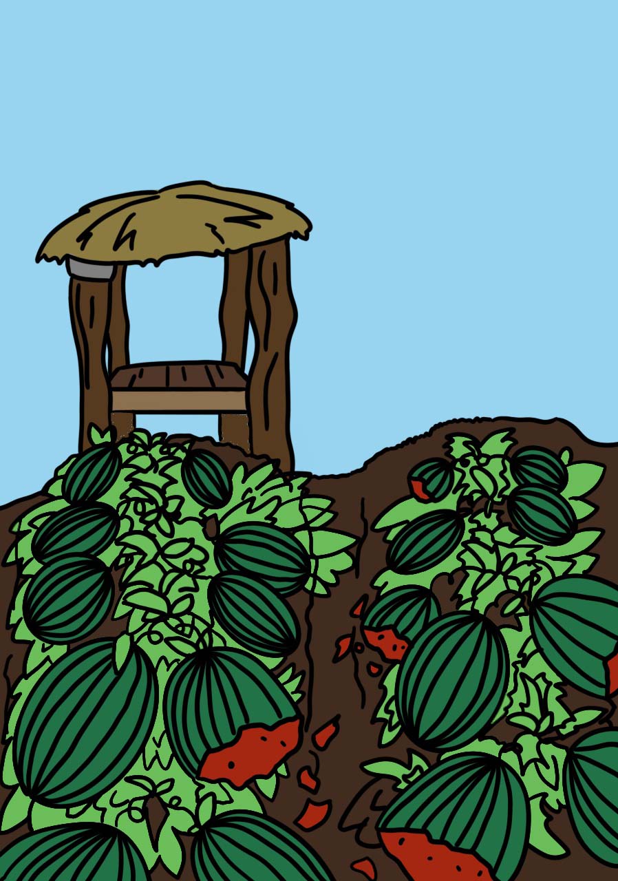 아저씨는 새로운 종의 수박을 수확할 기대를 품고 이 동네 밭을 사서 크게 농사짓기 시작했는데