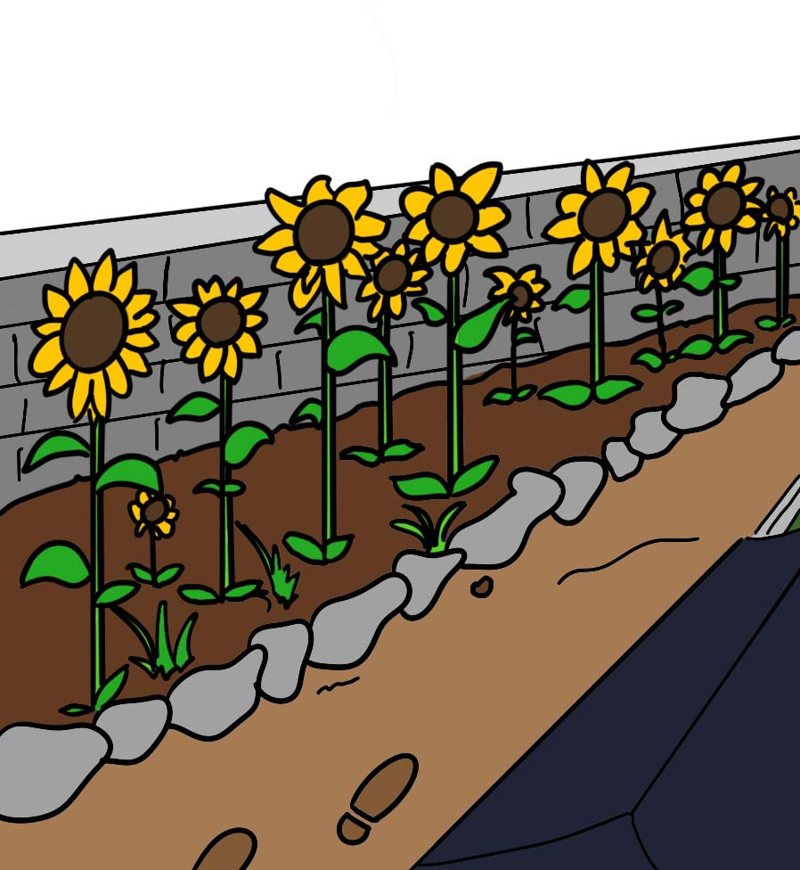그리 높지 않은 언덕의 끝집으로 집에 들어서는 긴 골목에는 해바라기들이 나란히 서 있었습니다.